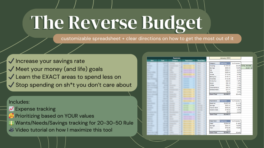 The Reverse Budget is a values-based money management tool. It's designed to help you stop spending money on things you don't care about and build a realistic plan for living a life that's meaningful to you.